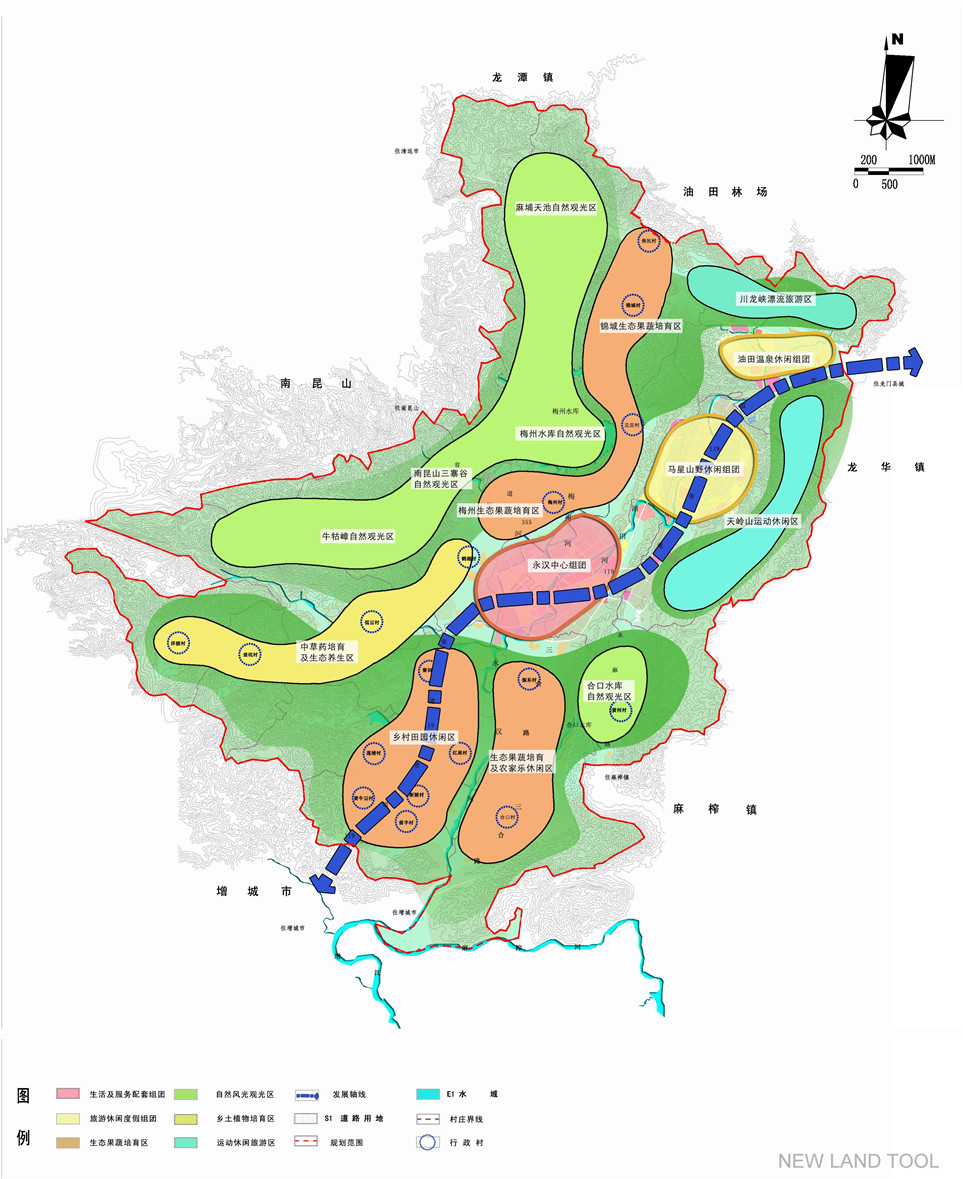 依托良好的山水田园和花画古迹等资源禀赋,综合考虑永汉镇的生态区位、游憩区位及区域协作职能、城镇体系职能等四方面,规划从多角度判研永汉镇的城镇职能,提出“以山水田园为特色,打造一方适宜生态栖居、生态旅游和生态休闲的珠三角生态后花园、广佛都市圈的生态卫星城”的发展目标,并将永汉中心镇性质定位为:惠州市北部以休闲旅游为主导的山水田园城镇;广东省集生态旅游、休闲度假和康健疗养于一体的山地游憩基地和旅游服务中心之一。至规划期末,镇域总人口11万人,镇域村镇建设用地总规模控制在14平方公里以内。其中远期建设用地规模7.94平方公里,远期规划城镇人口规模8万人。